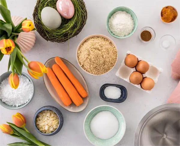1. Preheat the oven to 170°C top and bottom heat. Grease spring form pan with butter. Wash and peel the carrots, grate and set aside. Separate eggs.
