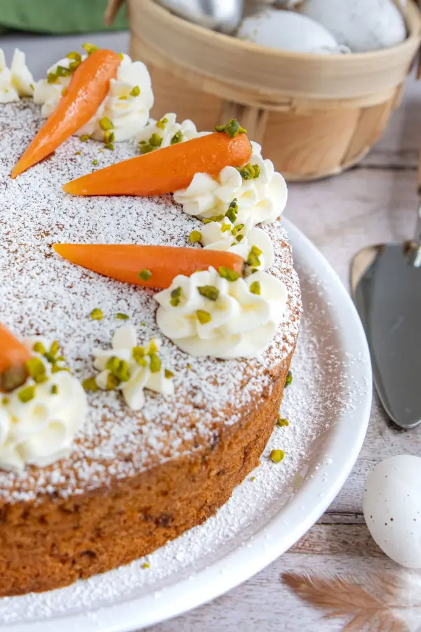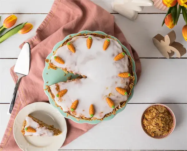 For the icing, sift icing sugar into a large bowl, gradually add water and whisk together until thick but still pourable. Once the cake has cooled completely, cover the cake with apricot jam using an offset spatula, then add the frosting evenly. For decoration, top with carrots and decorate the edges of the cake with sliced almonds.