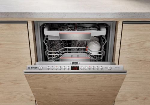 Installed under the kitchen counter, fully integrated dishwasher are seamlessly concealed behind your kitchen cabinetry. With full-panel furniture fronts on the door and a continuous plinth panel, the fascia panel of fully integrated dishwashers are integrated dishwashers are integrated in tip of the dishwasher door and can only be seen when the door is ajar.