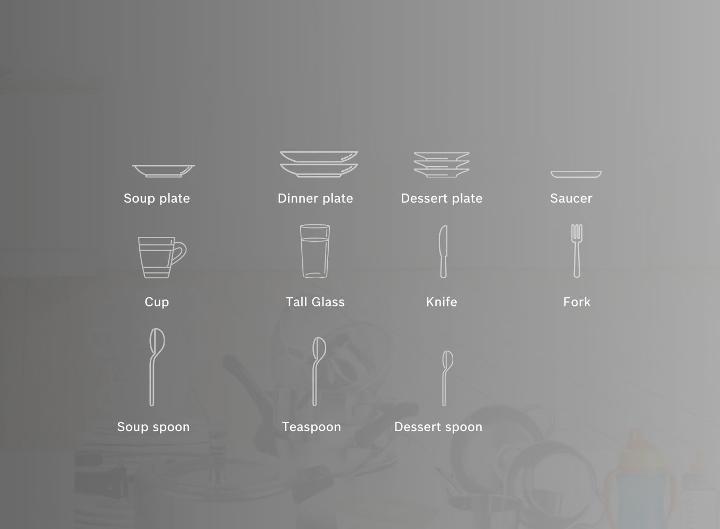 A 'place setting' consists of the following table ware: soup plate, dinner plate, dessert plate, saucer, cup, tall glass, knife, soup spoon, teaspoon and dessert spoon